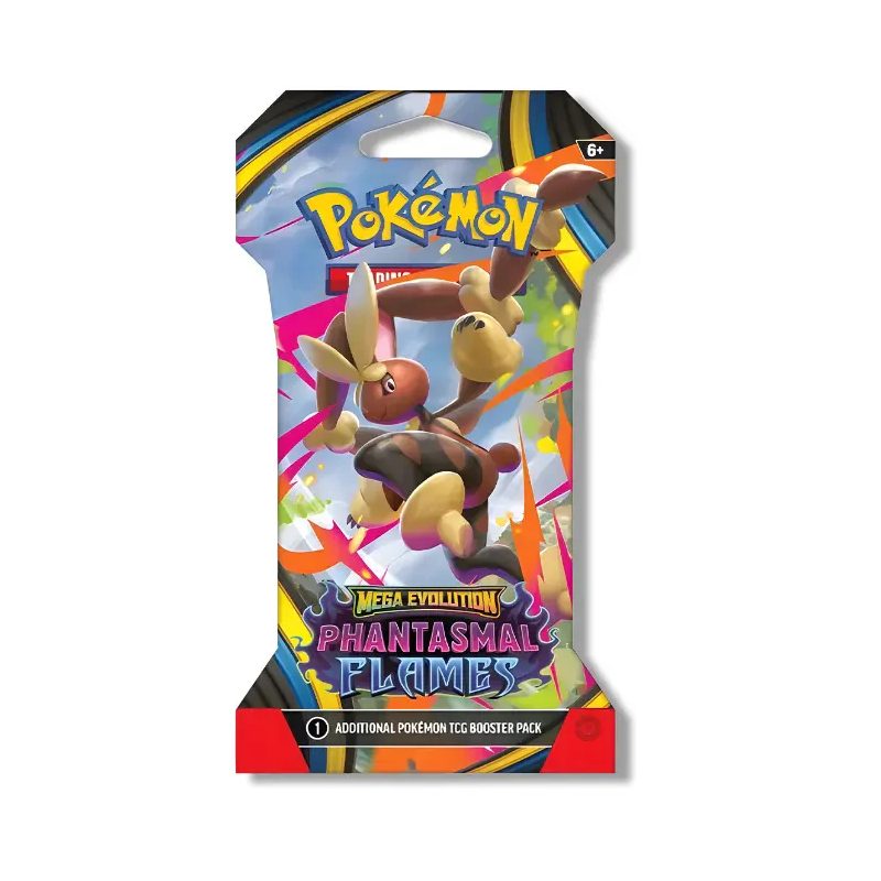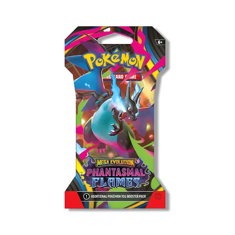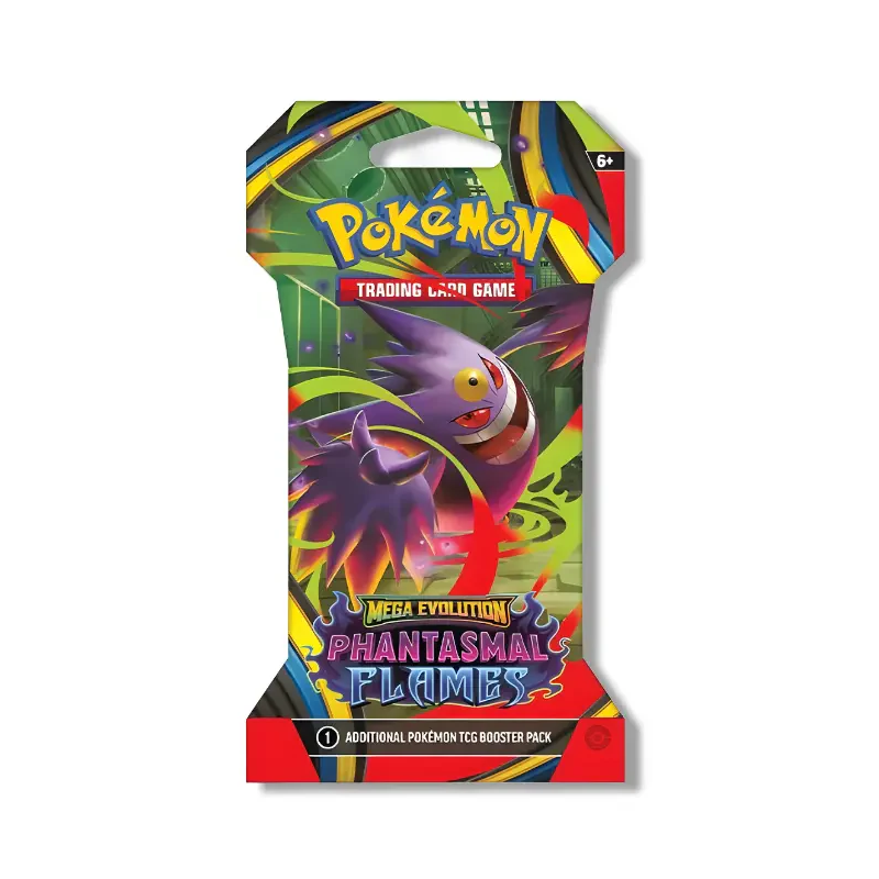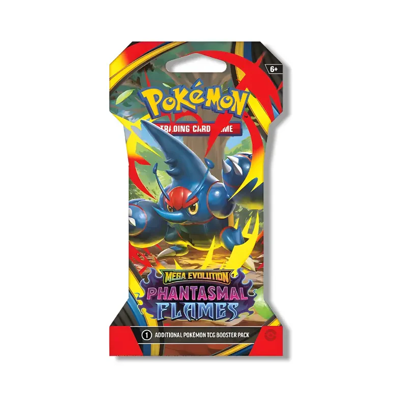Retail‑ready sleeve, same great pulls. The Phantasmal Flames Sleeved Booster Pack comes in a branded cardboard sleeve—ideal for peg displays and gifting—containing one standard booster pack inside.