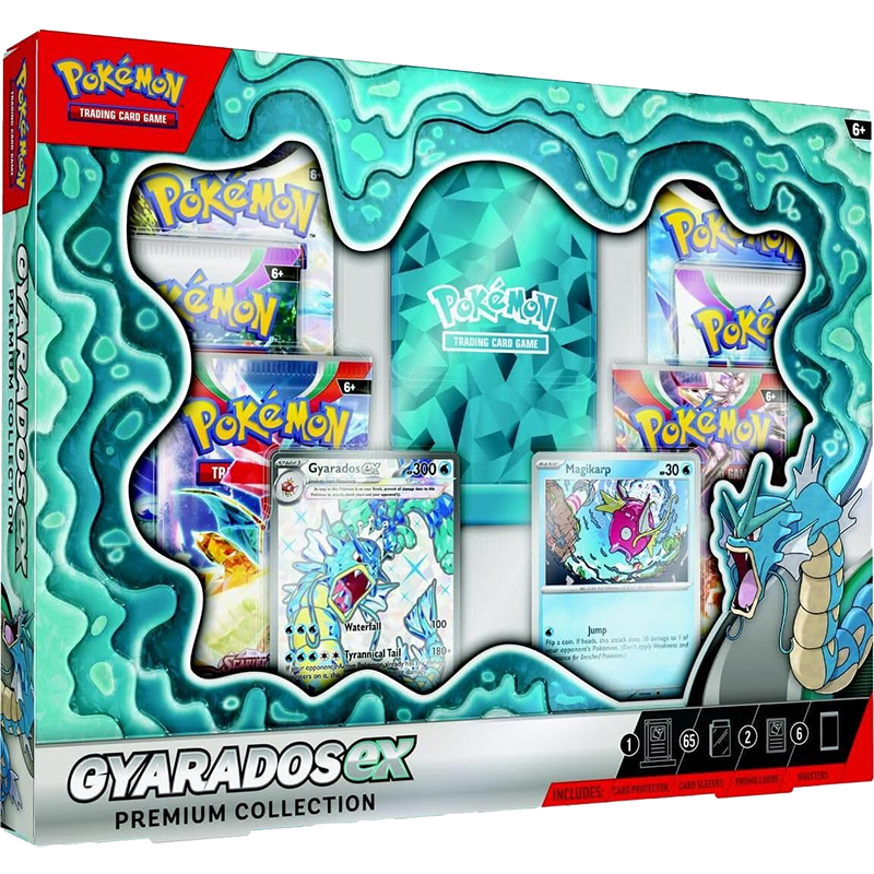 Roar of the sea. The Gyarados ex Premium Collection highlights the mighty Water‑type with a full‑art Gyarados ex promo and jumbo card plus six boosters to power up your binder and decks.
