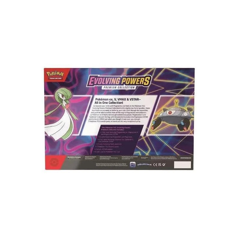 Power up your collection. The Evolving Powers Premium Collection bundles foil promo cards, an oversize display card, and a selection of Pokémon TCG booster packs in a single premium box.